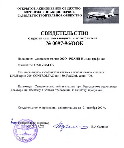 Октября 2005 г. Наша компания признана официальным поставщиком - изготовителем для ОАО "ВАСО" (Воронежское авиастроительное объединение).